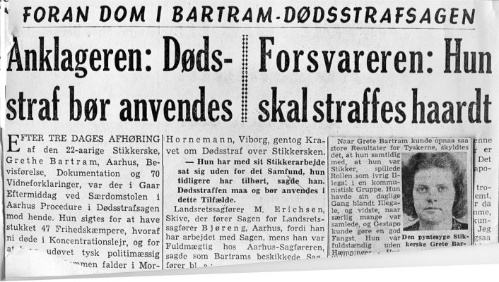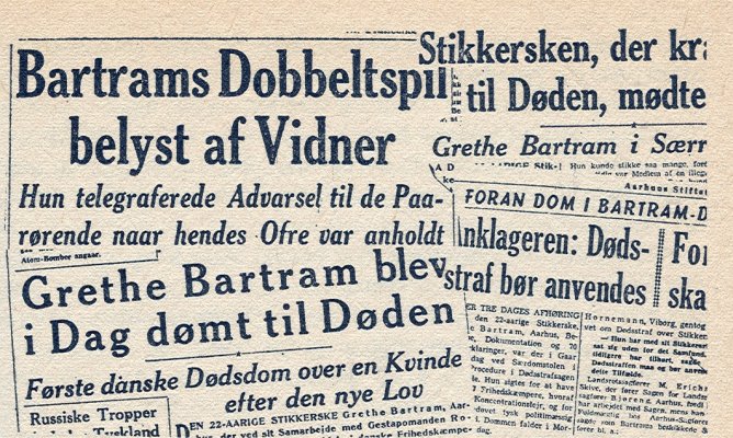 < Ikke underligt at sagen mod Grethe Bartram optog pressen. Det var den første sag, hvor en kvinde blev dødsdømt efter Straffelovstillægget af 1. juni 1945. Her et beskedent udvalg af avisoverskrifterne fra dengang.