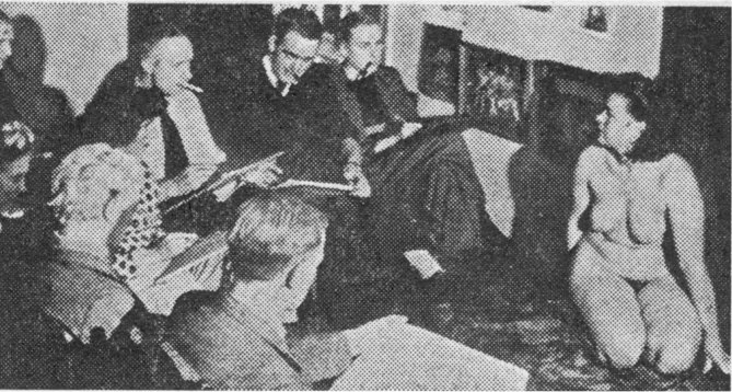 < > For at tjene til det daglige brød for sig og sit barn måtte velskabte Grethe Bartram i besættelsesårene også arbejde som nøgenmodel for en gruppe kunstnere. Billedet blev gengivet i 1944 i en række illegale blade, da man havde fundet ud af, at hun var storstikker for Gestapo. Kunstneren i midten (med cigaret) er kunstmaleren Chr. Thorvald Larsen, som var en af dem, Grethe Barttram angav til Gestapo i Århus. Desuden hans to sønner. Både han og den ene af sønnerne omkom i en tysk Koncentrationslejr.